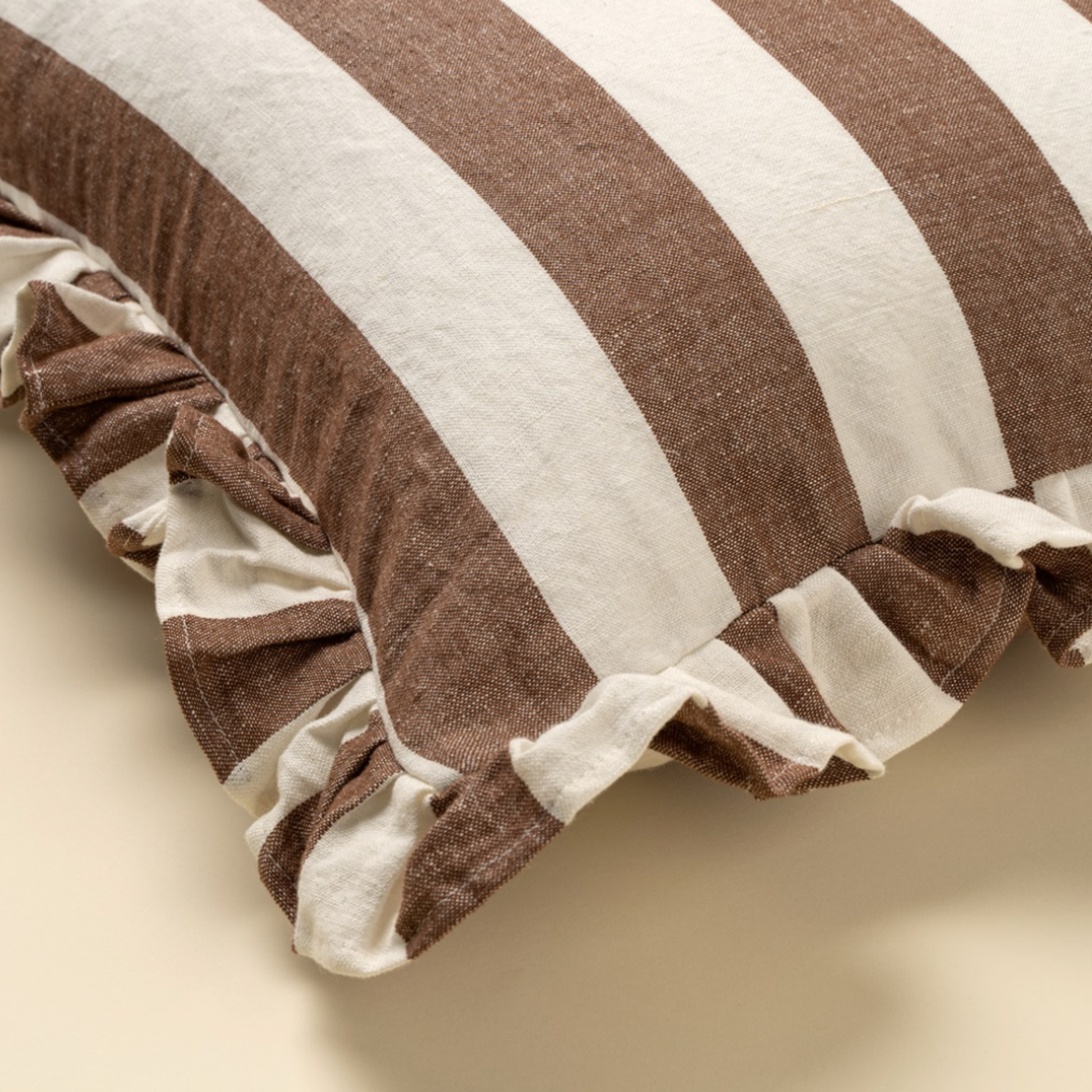 Add a playful yet polished accent to your home with the Ruffle Thick Stripe Pillow. Handmade from a 50% linen, 50% cotton blend, this pillow pairs classic stripes with a soft ruffle border for a timeless French cottage feel. Wide, neutral stripes bring relaxed elegance, while the ruffled trim adds a cozy touch to your bedroom or living room decor.