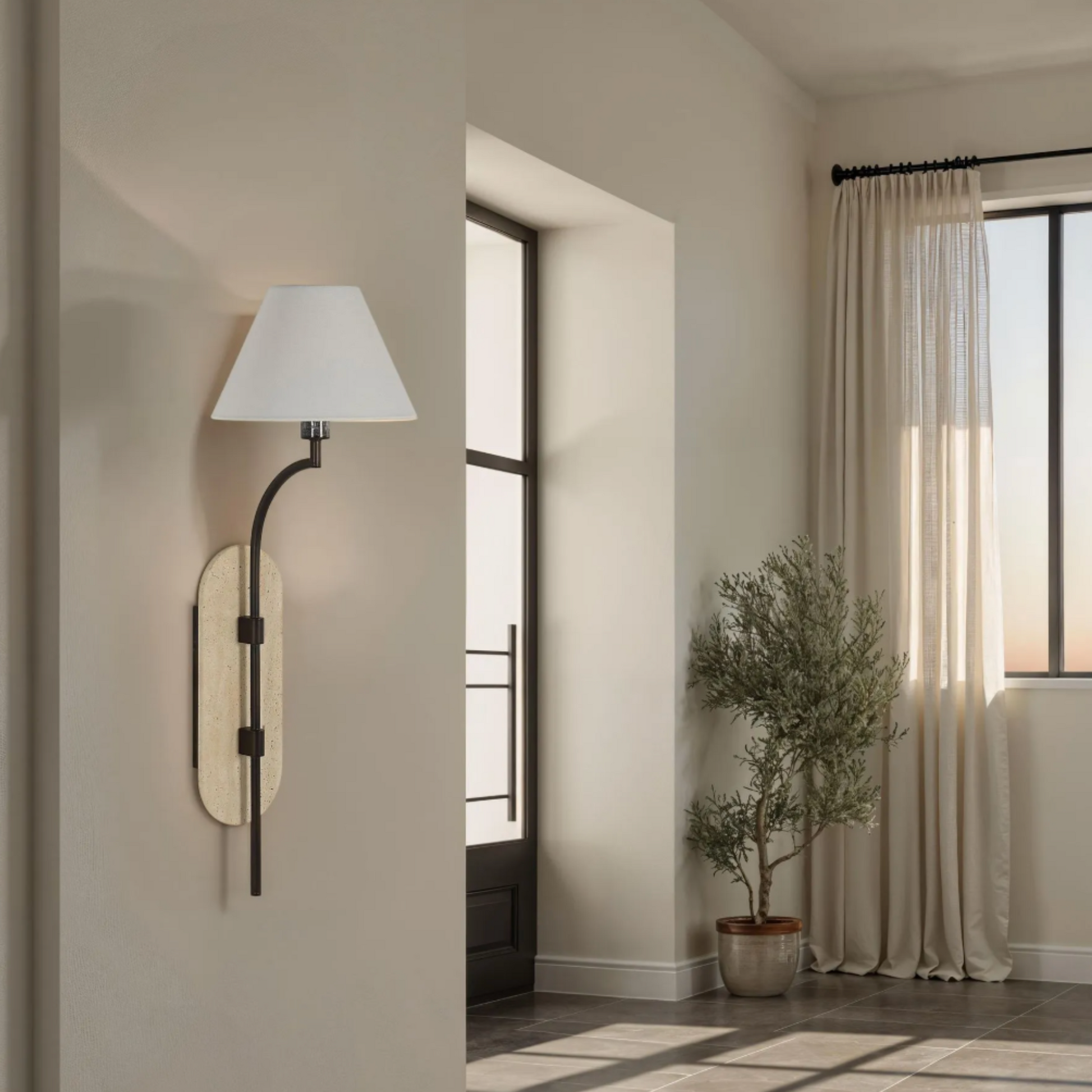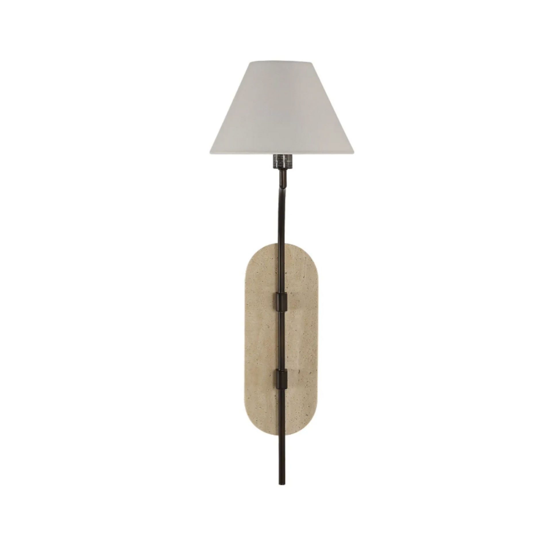 When it comes to layering lighting, it’s important to cover all your bases and that includes walls. Designed with a modern yet historic feel, this wall sconce is composed of artfully chosen materials including travertine and dark antique bronze-finished iron. Its ivory linen tapered drum shade delivers a classic touch and the perfect level of illumination.