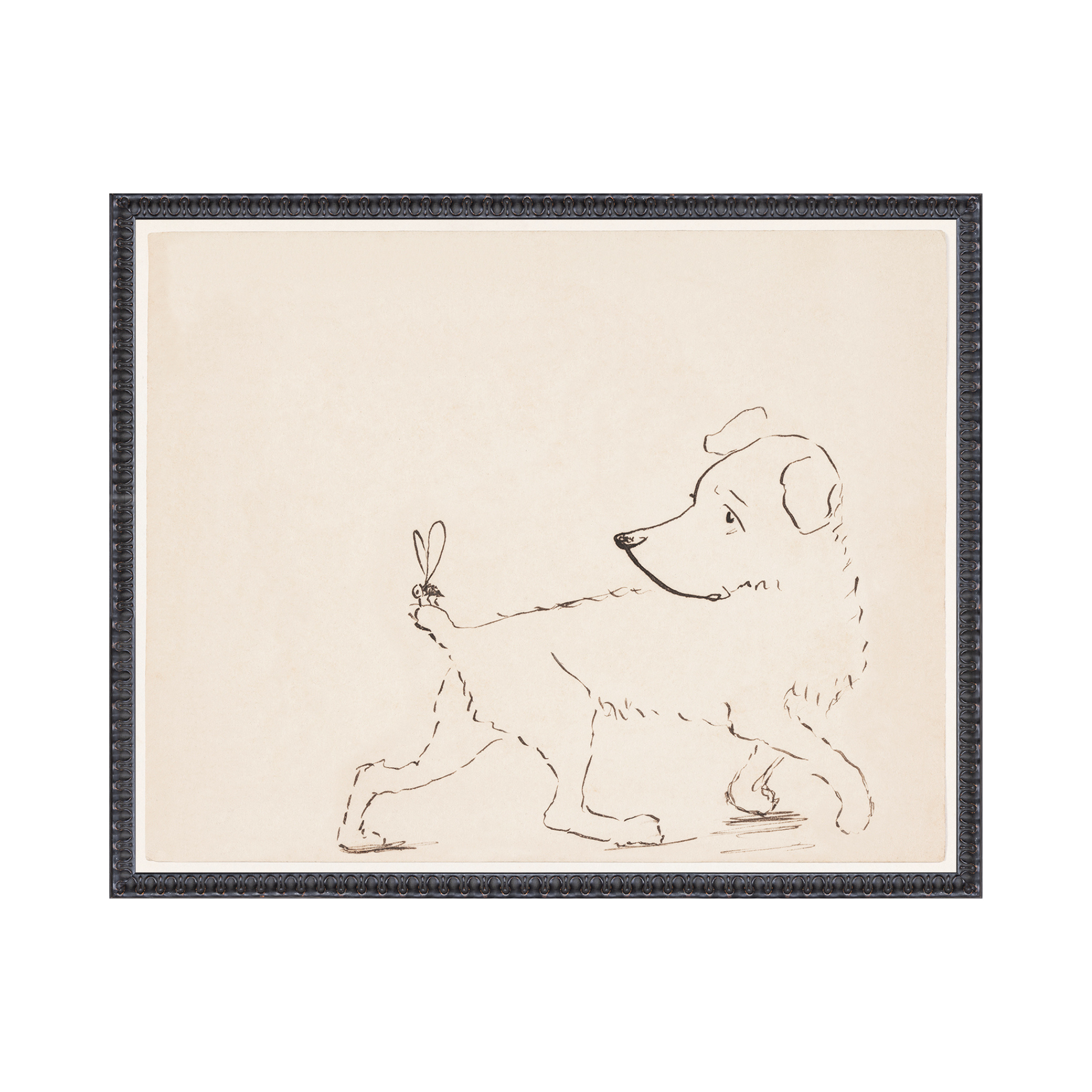This adorable sketchy pup looks back at his buzzing friend that’s catching a ride on his tail. The loose lines of this drawing add to the fleeting nature of this charming moment.