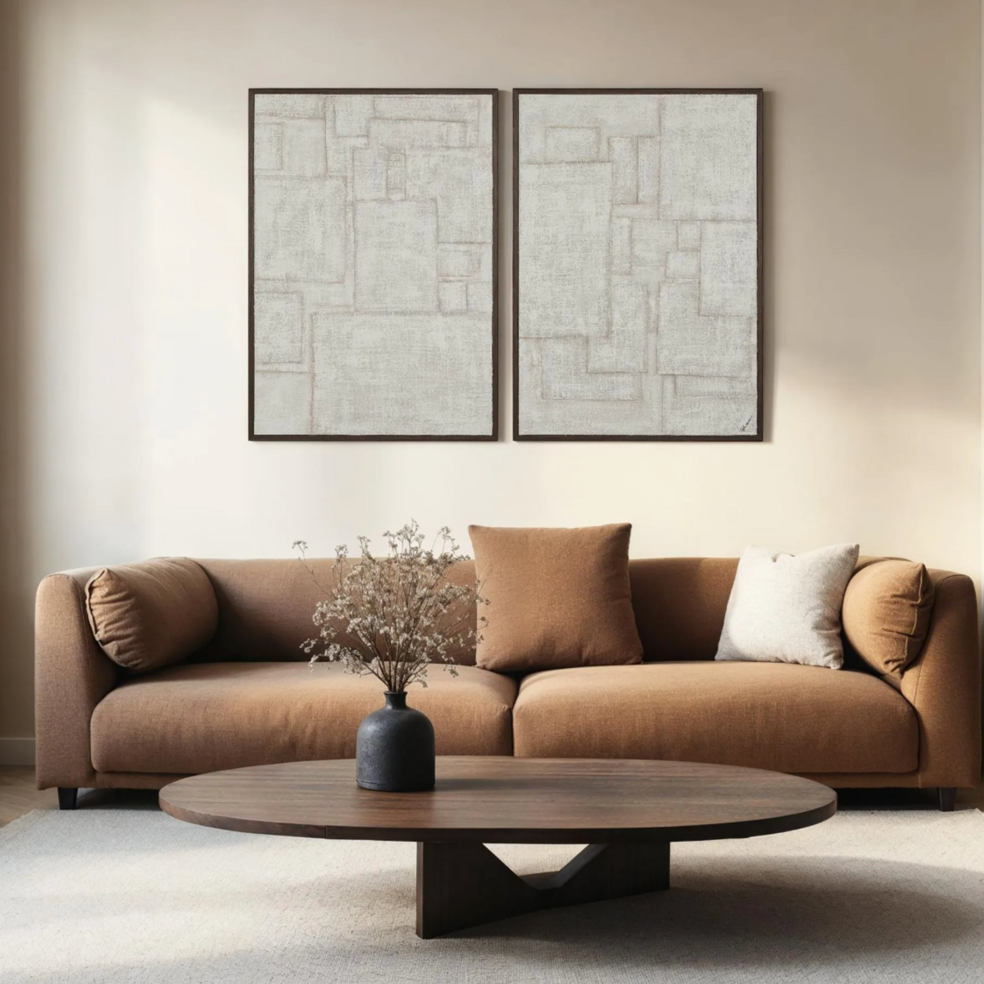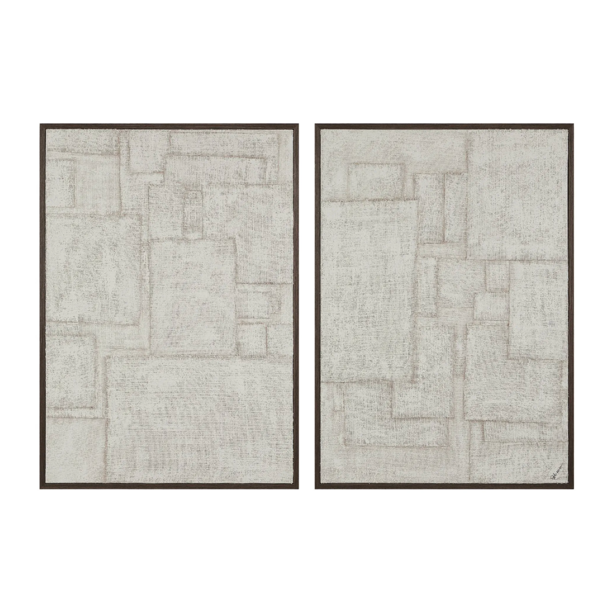 Complete the look of any neutral interior with this stylish collage style wall art. Featuring textural burlap touches and a sand beige finish, this hand-painted set of two framed cotton canvas pieces is set to elevate any contemporary home or office.