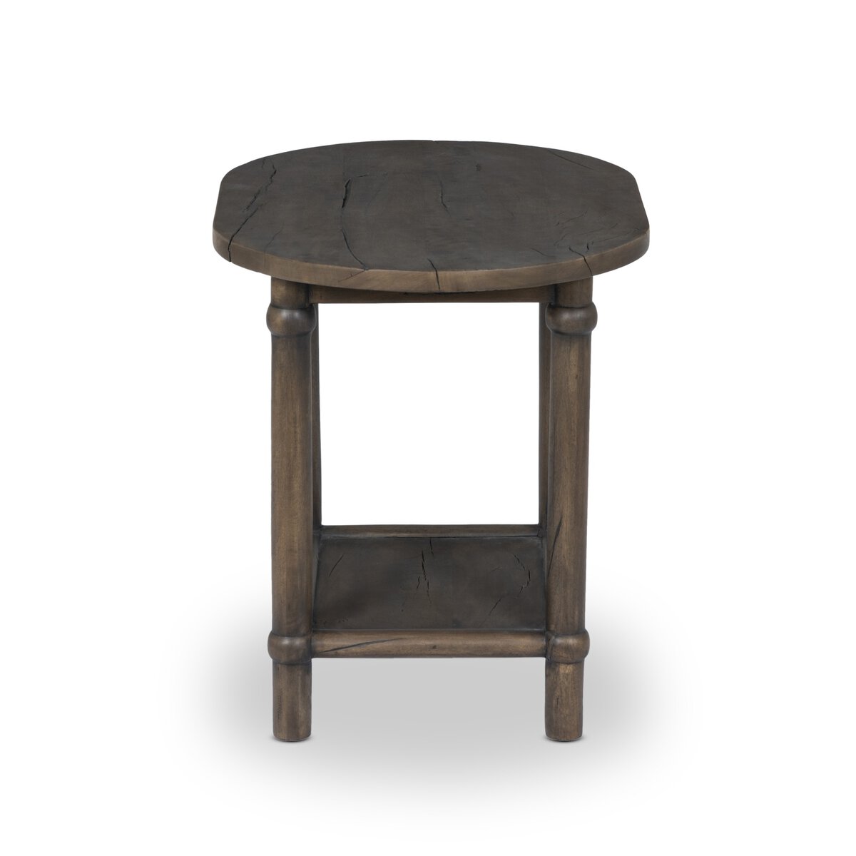 Crafted from brown reclaimed wood with natural antiquing. A rounded bullnose edge and lower shelf add functionality, while round ball details provide a crafted finish.