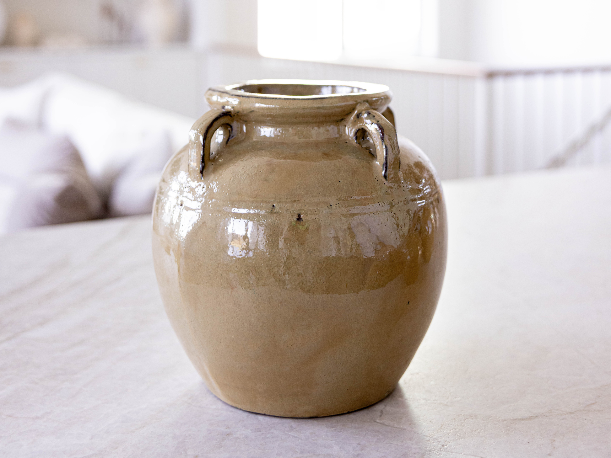 Chevalier Cream Glazed Vase With Handles Large is a vintage inspired vase, made from terracotta. It is ideal for bringing a touch of originality to your home decor, whether placed on shelves, coffee tables, dining tables, or in bedrooms.