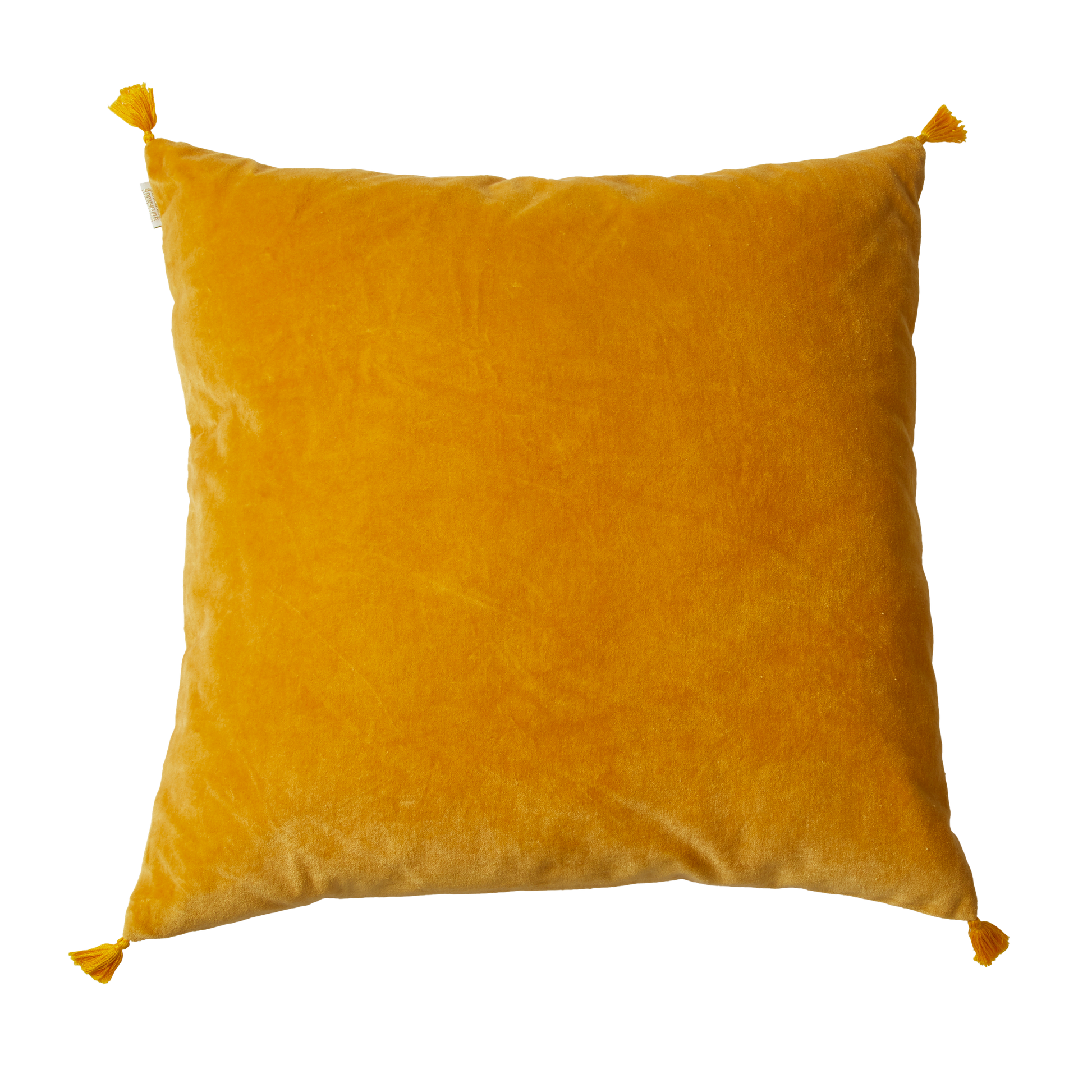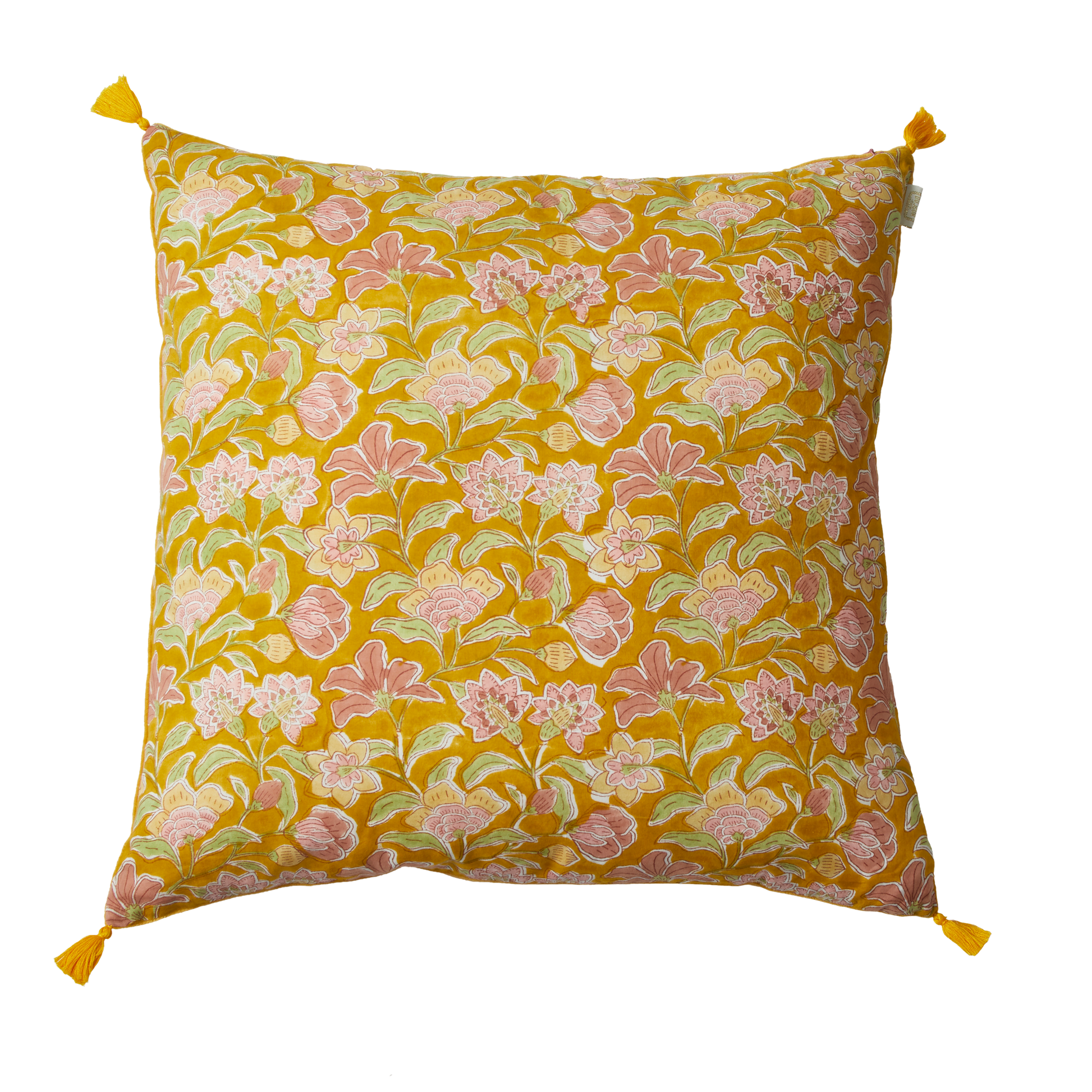 Cushion cover printed with Indian flowers designed in France and sewn with love in our Indian family workshop. Fall in love with this exclusive print. Its design has been engraved on a wooden stamp and then printed with this beautiful craft technique of "block print". On the second side, we chose to apply some soft velvet, finished with a pompom, iconic to the brand.