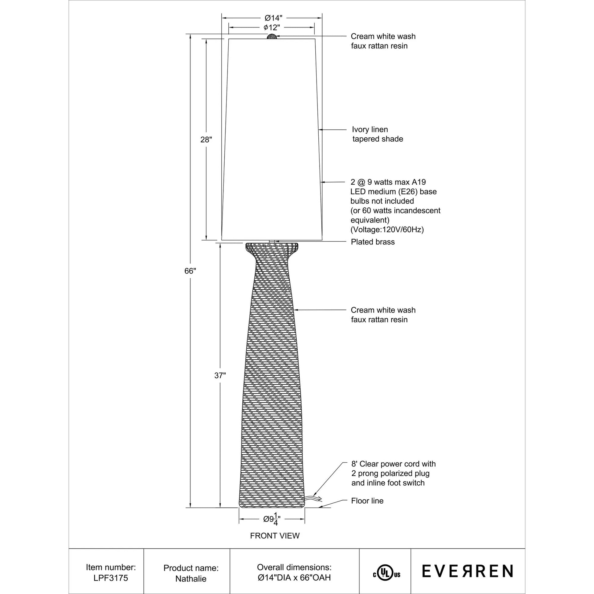 Create a beachy vibe in any home or office with the Nathalie floor lamp. Designed with a faux rattan white-washed finish, its long and lean body is emphasized further by an elongated ivory linen shade to deliver a casual look with a whole lot of presence. Further elevating its easy breezy style is its customizable light intensity that can be adjusted to suit the mood, all at the tap of a convenient foot switch.