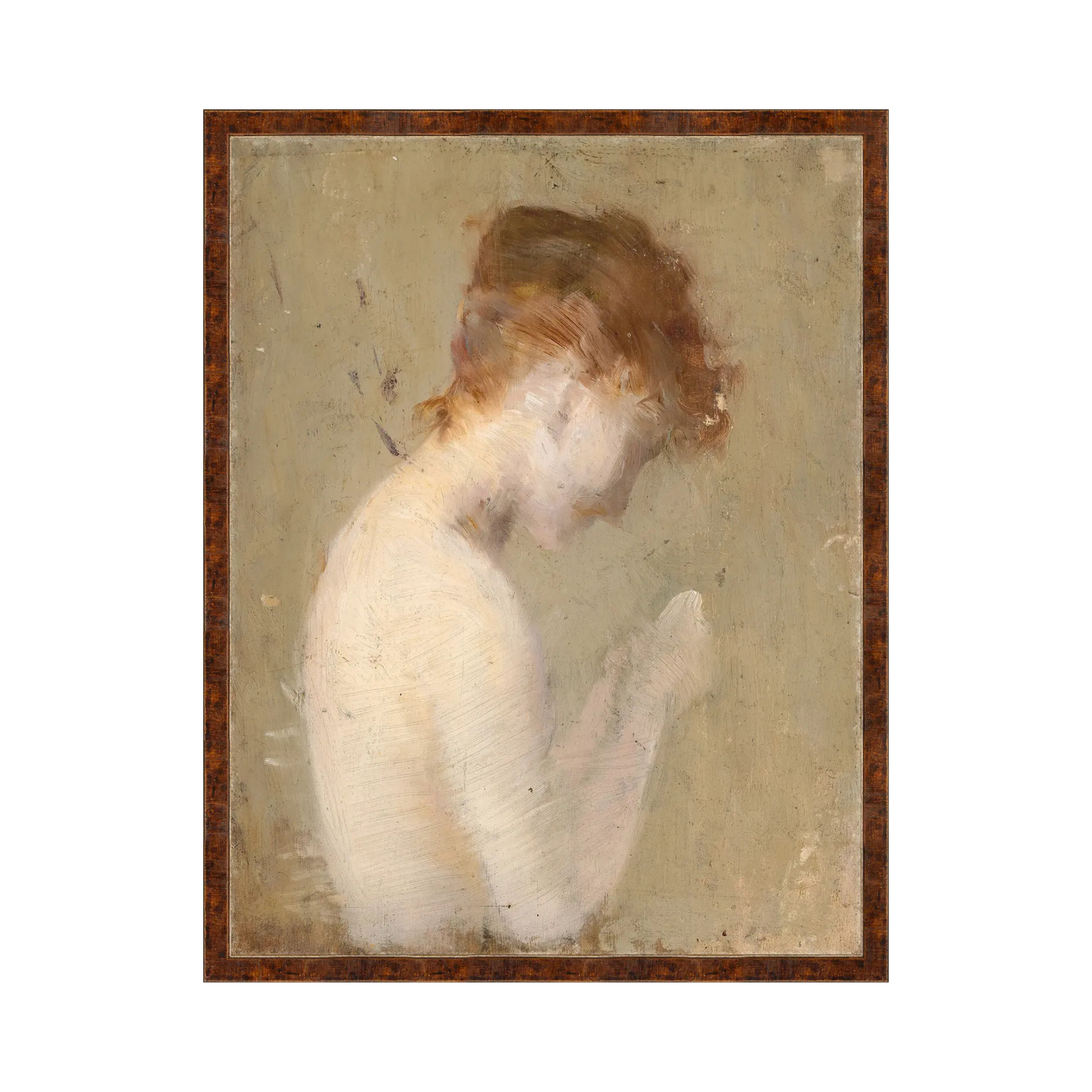 The model looks away from the viewer and hides her face in this image. But the artist has further obscured her features with a careful eye and sweep of the brush. Finished in a wood frame with a tortoise shell coloured veneer.