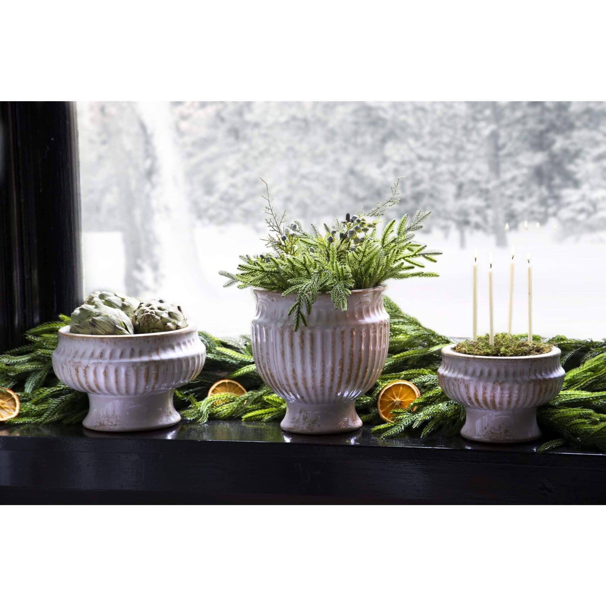 This white low round pot on a foot brings a sleek, modern touch to your home decor. Its minimalist design and sturdy base make it perfect for showcasing plants or as a stylish centerpiece. The elegant white finish complements any style, adding a clean and sophisticated look to any space.