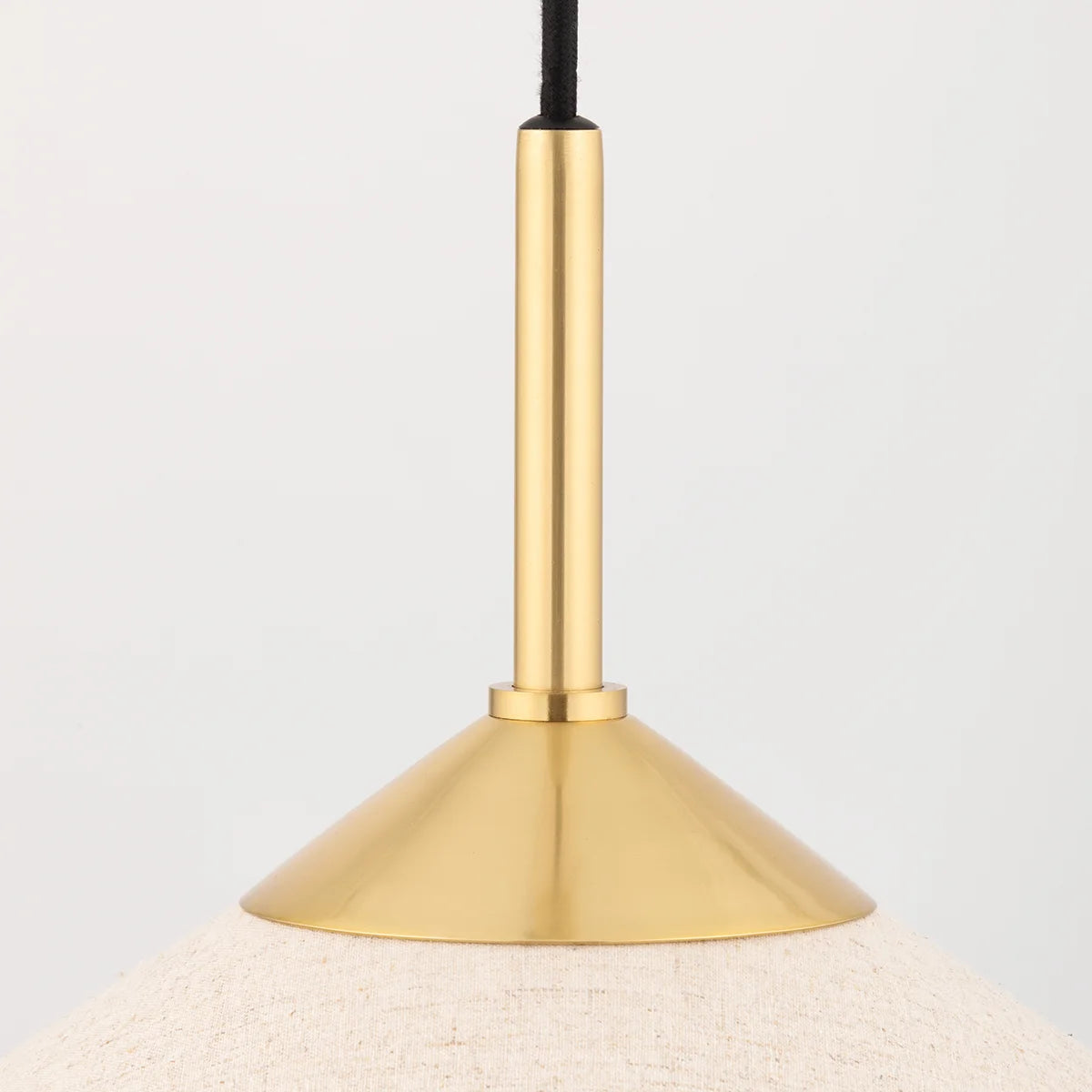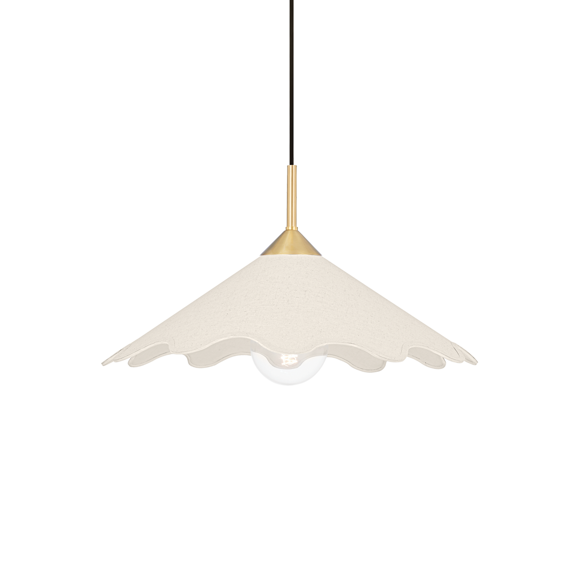 Crisp, clean and effortlessly chic, Sodsai elevates the traditional pendant light. Pretty scalloped detailing on the natural linen shade soften the design. Just a hint of the clear glass bulb is visible from beneath the shade, sending a bright, clear light below while filling the shade above with a warm glow. The white shade, aged brass finish and black fabric-covered cord perfectly complement each other—and any color scheme.