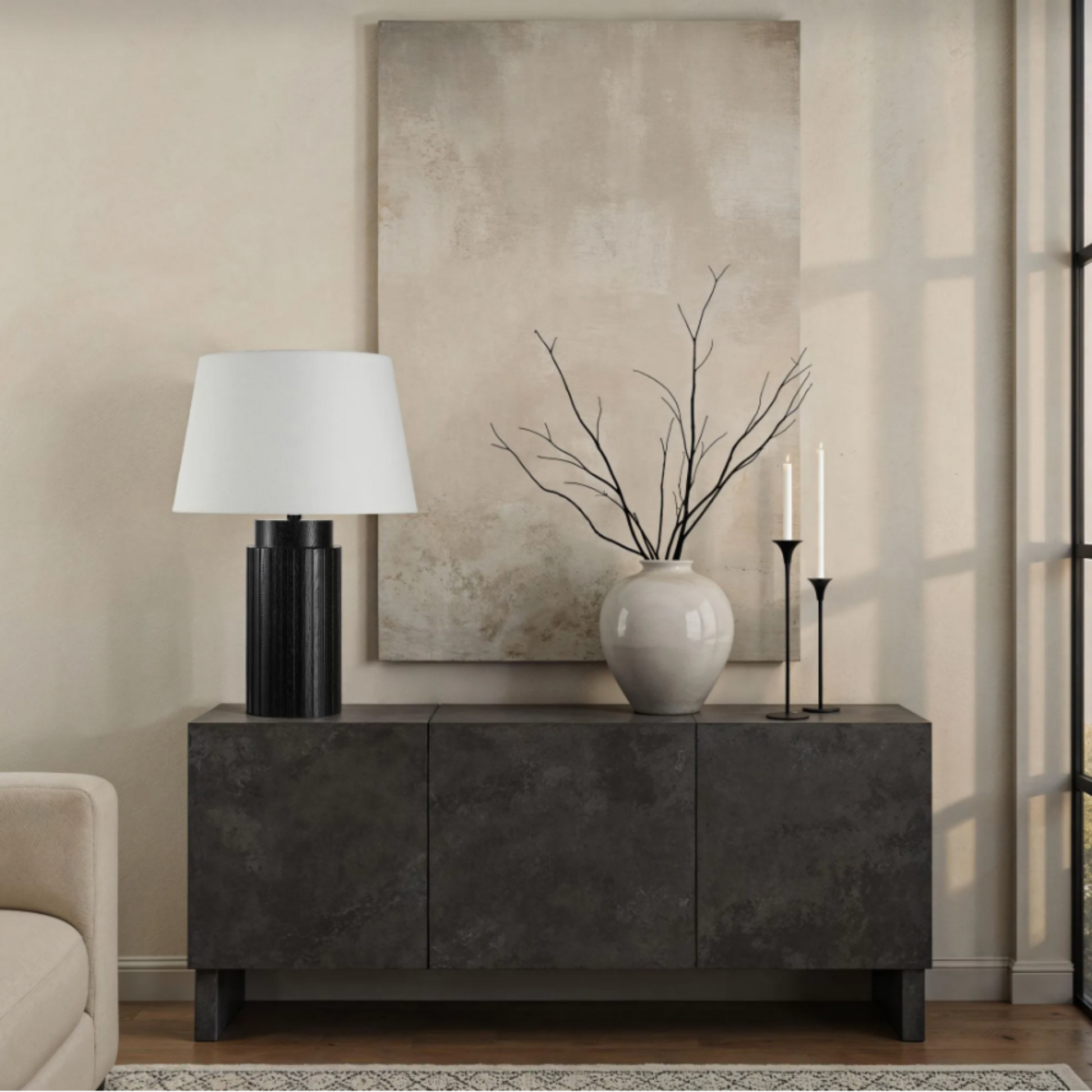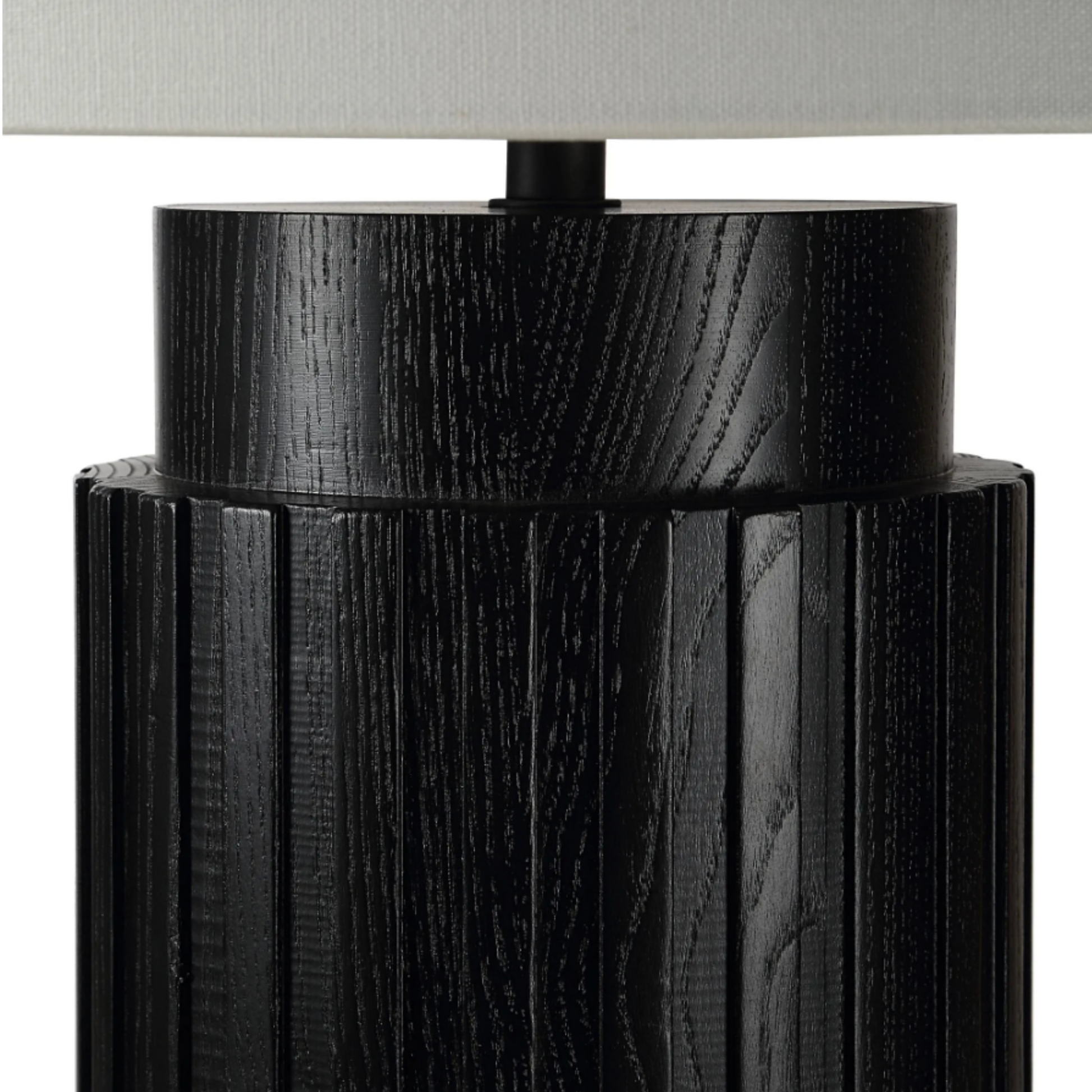 Part of the Steven Sabados collection, this table lamp brings a modern aesthetic to the world of lighting. Featuring a minimalist style, this light is crafted from ash wood with an on-trend ribbed base and a matte black stain. Topped off with a clean-lined tapered linen drum shade, this lamp is the perfect complement to contemporary interiors.
