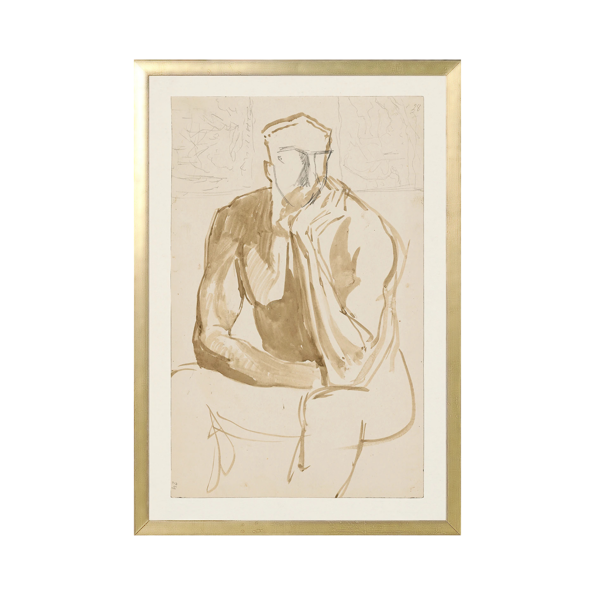 A creative bold sketch of a sitting man by Ladislav Mednyanszky. Intriguing, abstracted details and warm taupes are presented in an antiqued gold frame.