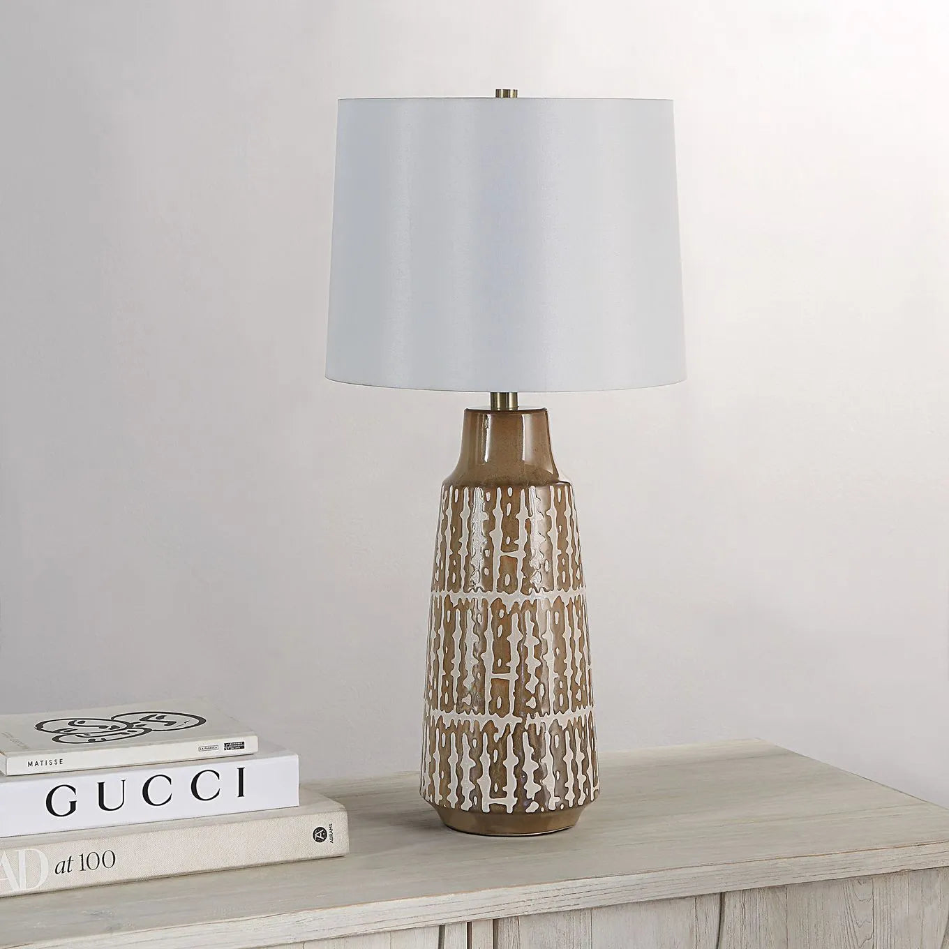 Featuring a tribal-inspired ceramic base, this table lamp design is an optimal accessory for the bohemian or modern interior. Clients seeking a lamp that adds equal parts character and creativity will find their needs are met in this ceramic table lamp design. Whether arranged as two in the bedroom or one in the living space, it is equally as enchanting.