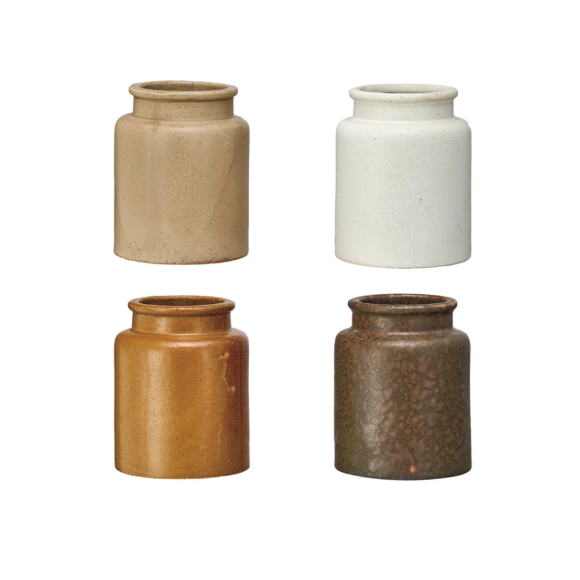 3-1/2" Round x 4-1/4"H Stoneware Vintage Reproduction Mustard Crock, Textured Finish, Reactive Glaze, 4 Colors (Each One Will Vary.